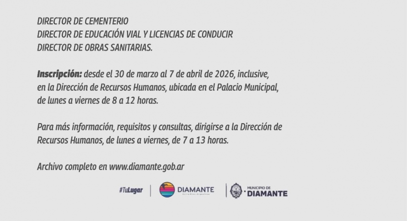 El Departamento Ejecutivo Municipal llama a Concurso Cerrado de Antecedente y Oposición para Empleados Municipales, destinado a cubrir los cargos vacantes de: Director de Cementerio; Director de Educación Vial y Licencias de Conducir y Director de Obras Sanitarias.
